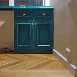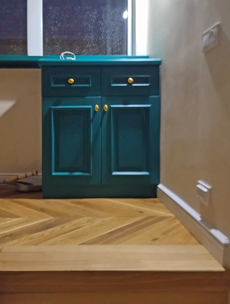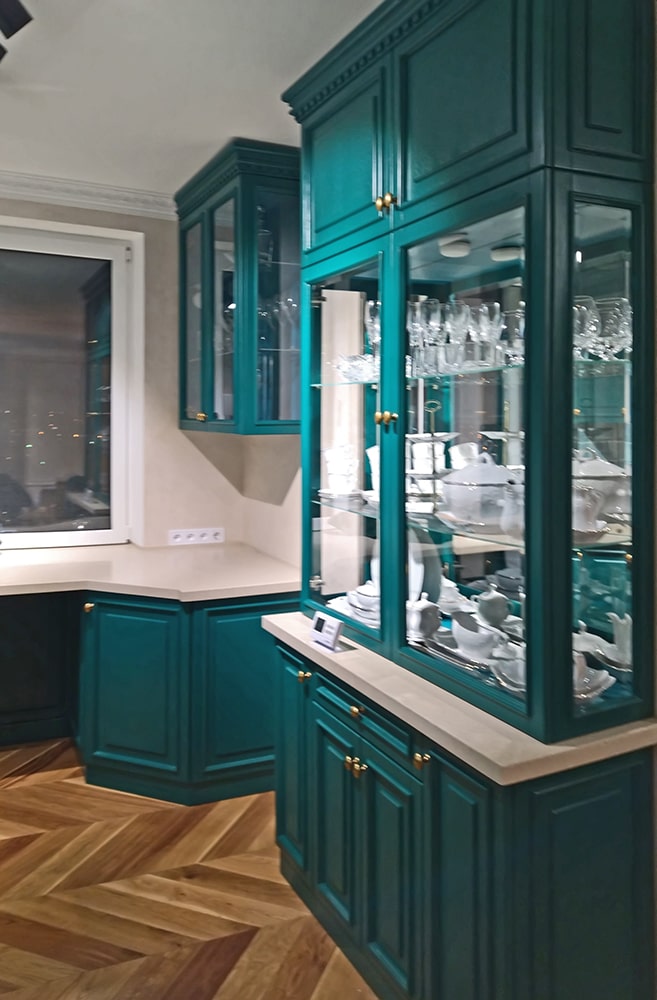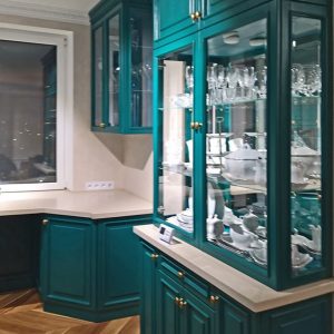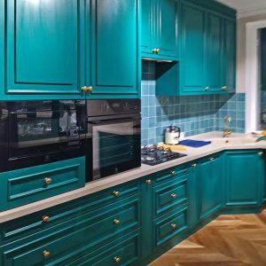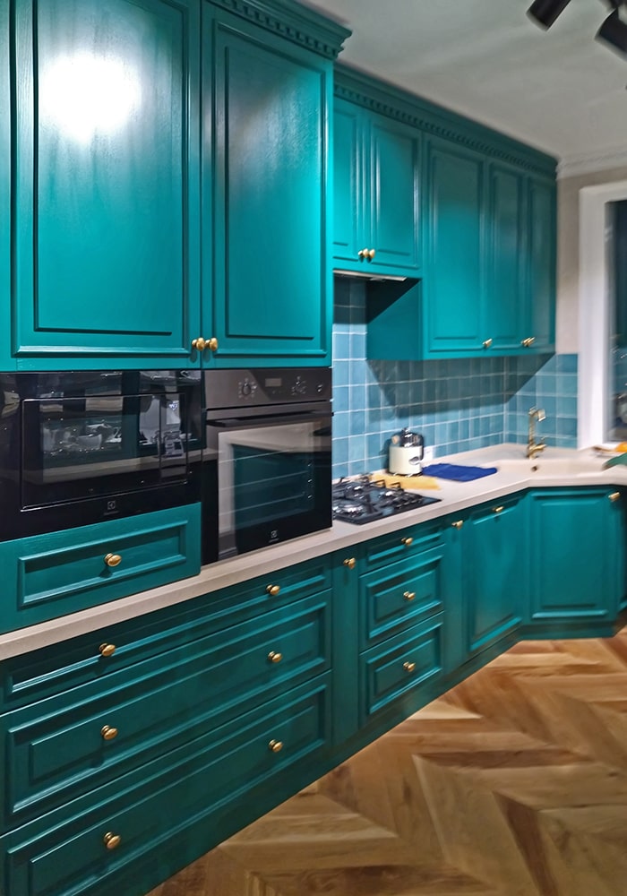 Класична кухня з дерев’яними фрезерованими фасадами кольору морської хвилі.